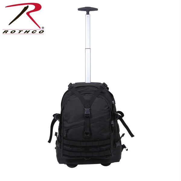 We took Rothco's Large Transport Pack and gave it wheels! Expect to see the same high quality backpack and features with the added benefit of a 39" high push button telescoping aluminum rod and wheels. We've padded the back of this tactical pack for added comfort and added a top carry handle for carrying but kept popular features, like the MOLLE webbing on the front and sides, the adjustable cinch straps, the large compartments, & hydration bladder compatibility.
